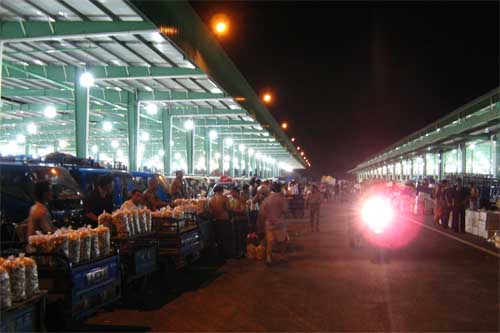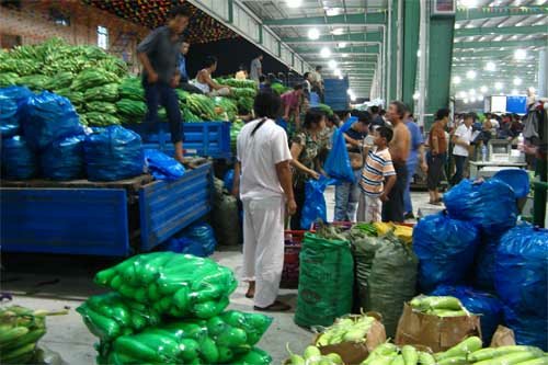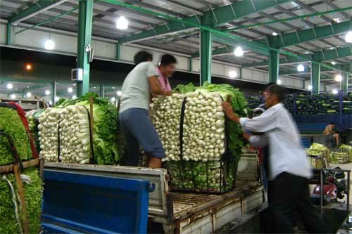 昨晚11點(diǎn)左右,忙碌了一天的城市逐漸告別喧囂進(jìn)入夢(mèng)鄉(xiāng),而位于黃巷北濱路的朝陽蔬菜批發(fā)新市場(chǎng)則是另一番洞天。記者驅(qū)車進(jìn)入市場(chǎng)時(shí),龐大的停車場(chǎng)已經(jīng)停放了數(shù)十輛大貨車,門外還有大貨車不斷涌入。遠(yuǎn)遠(yuǎn)向交易區(qū)看去,一盞盞晶瑩剔透的吊燈將三個(gè)綠色大棚照得如同白晝。交易區(qū)內(nèi),貨車一字排開,經(jīng)營(yíng)戶們開始忙碌地將車上的各類蔬菜卸在地上并整齊地堆放好。漸漸地,貨車越來越多,小商小販的電瓶車也隨之不斷涌入。由于交易市場(chǎng)有一個(gè)主通道,四個(gè)副通道,形成車輛內(nèi)部環(huán)形圈,所以現(xiàn)場(chǎng)井然有序,并沒有出現(xiàn)擁堵情況。