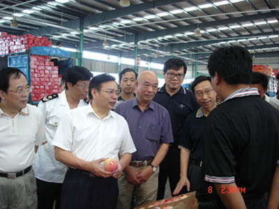 9月8日,無錫市副市長談學明來朝陽農產品大市場視察。朝陽集團公司董事長張海良、總經理楊興德分別向市領導匯報了朝陽農產品大市場為確保中秋國慶節日供應,農產品大市場在蔬菜、水果、糧油等商品的組織、儲備、供應方面所做的工作。