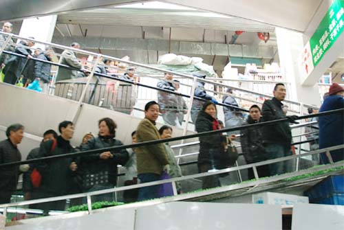 早上7點開始,一直到下午18點,槐古支路上,市場門口早已排滿各種非機動車輛,市場一樓的蔬菜區用寸步難行來形容并不過分,各個攤位前擠滿了買菜的人群。無錫市民過節必備的如意菜--黃豆芽攤位前,以及肉類加工區、家禽屠宰區更是排起了長龍。這也是朝陽農貿市場新樓開業后所出來沒有過的熱鬧。