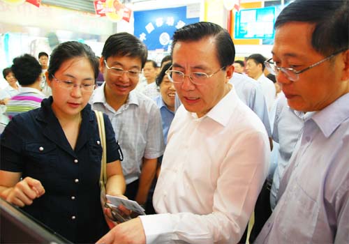 在超市門口擺放的電子觸摸屏引起了朱克江代市長的興趣,通過這臺與農產品備案中心臺聯網的平臺,顧客可以地利用電子秤計量票據,方便地查詢到來自批發市場交易系統的農產品產地信息。朝陽集團總經理楊興德向朱克江代市長介紹了正在實施中的這一農產品安全追溯體系建設的有關進展。