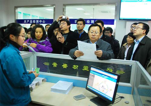 在位于無錫朝陽農產品大市場的蔬菜備案中心,常司長一行仔細查驗了蔬菜經營者注冊備案流程。無錫朝陽集團總經理楊興德向督查組匯報了無錫朝陽集團依托農產品大市場,并結合本溯源項目,投入大量的人力、資金,切實開展農產品電子化交易結算,認真實施農貿市場溯源節點管理,在批發市場、農貿市場、連鎖超市農產品追溯等方面均取得了顯著的成效。