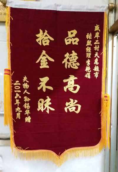 9月5日,常在天惠超市盛岸店購物的孫錫華女士,手捧“品德高尚 拾金不昧”的錦旗來到門店,一邊連聲道謝,一邊親手將錦旗贈與張熙經理和水果區員工李艷娟。原來,在8月28日,孫女士在盛岸店購物時,不慎將一部價值3500元且含有大量重要信息的手機遺落。后被水果區員工李艷娟撿到并及時上交給張熙經理。門店經多方查找,聯系到了孫錫華女士,將其遺失手機原物奉還。失主為表感謝之情,于是就發生了上述贈送錦旗的感人一幕。 盛岸店員工用實際行動詮釋了“為民、利民、便民”的企業宗旨;他們拾金不昧的精神,急顧客之所急的工作作風,更值得我們學習。  2016年9月6日 |
