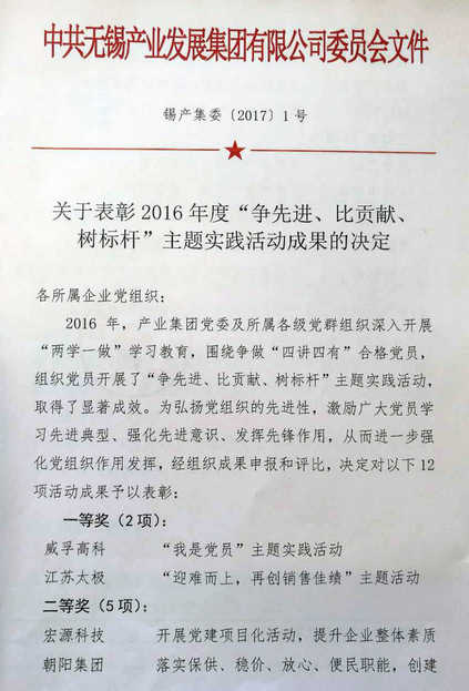 無錫朝陽集團黨委在產業集團黨委2016年度主題實踐活動成果評比中榮獲二等獎