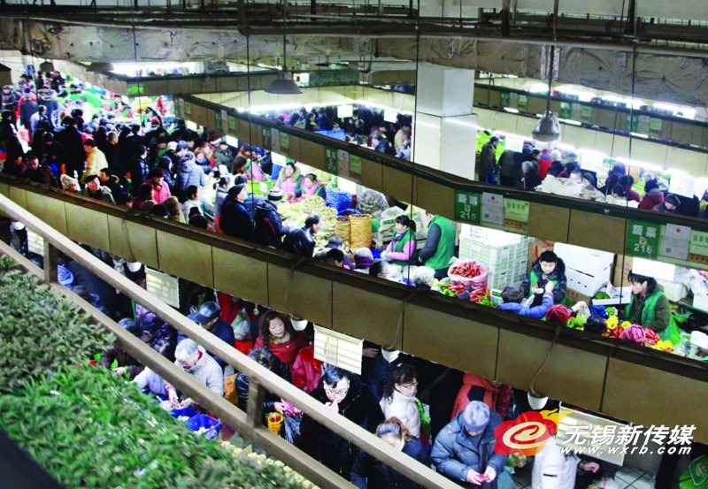 昨天,朝陽農貿市場被四面八方源源不斷涌來的“年貨大軍”塞得滿滿當當,就連過道上都是人擠人,一分鐘有3600多人涌向扶梯。春節臨近,昨天無錫放晴,馬大嫂們紛紛抓緊時間備年貨。上周六起,節前消費高峰就已“蠢蠢欲動”,被周日上班一攪和,直到昨天才正式啟動——接待“年貨大軍”17-18萬人次,僅蔬菜的日交易量就在120噸以上。 該市場負責人華艷告訴記者,該市場所有的管理員、后勤人員、保衛科員工以及保安等全部出動,到市場周邊引導車流、人流,以維持路面交通的通暢,同時在上下樓扶梯安排人手維持秩序。在電梯上行入口維持秩序的管理人員數了數:1分鐘內有3600個人進入農貿市場。