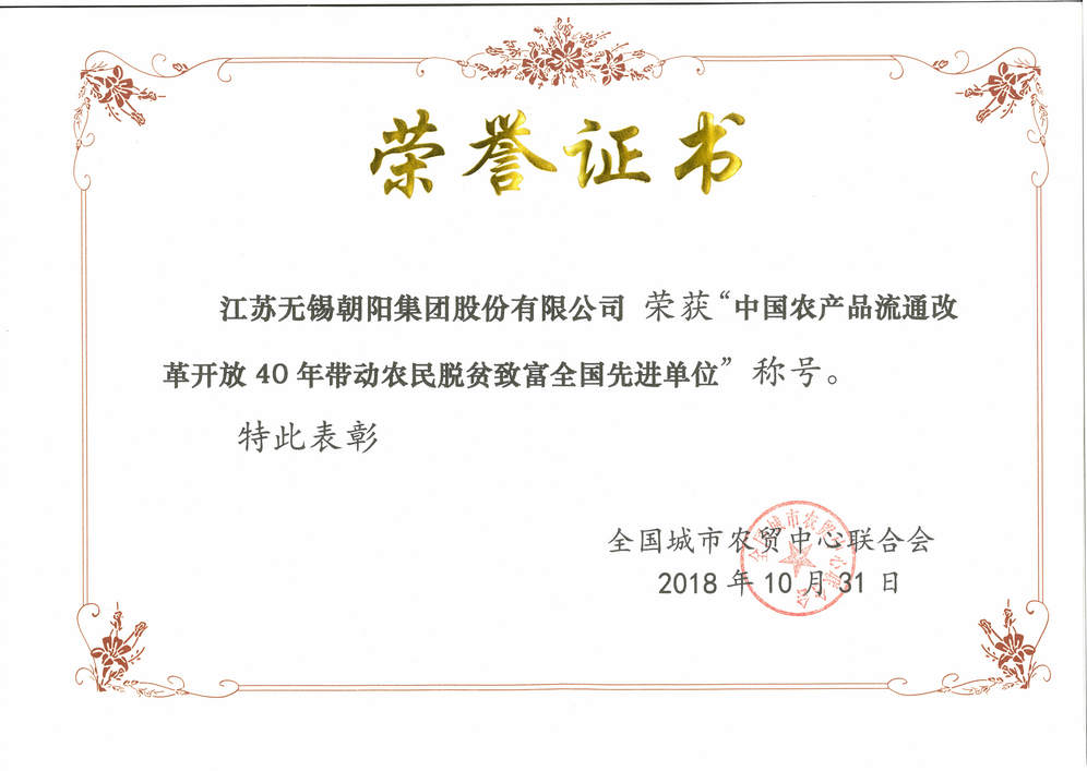 江蘇無錫朝陽集團股份有限公司榮獲“中國農產品流通改革開放40年帶動農民脫貧致富全國先進單位”稱號;