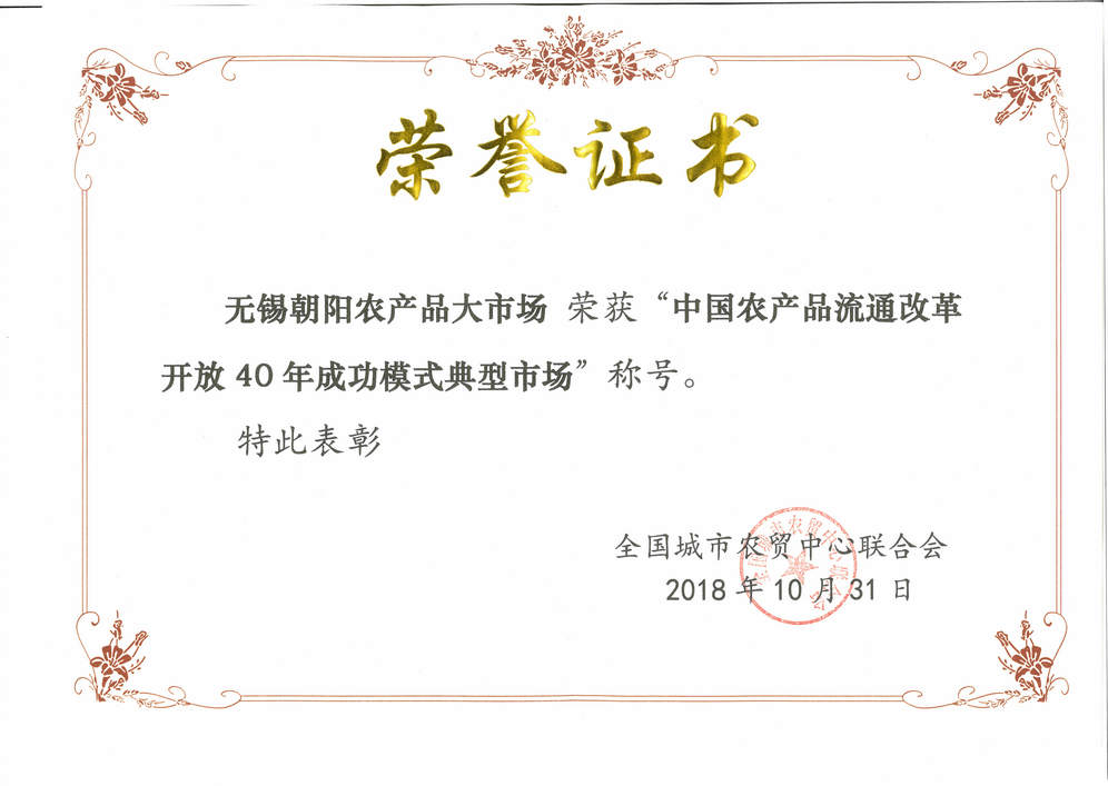 無錫朝陽農產品大市場榮獲“中國農產品流通改革開放40年成功模式典型市場”稱號;