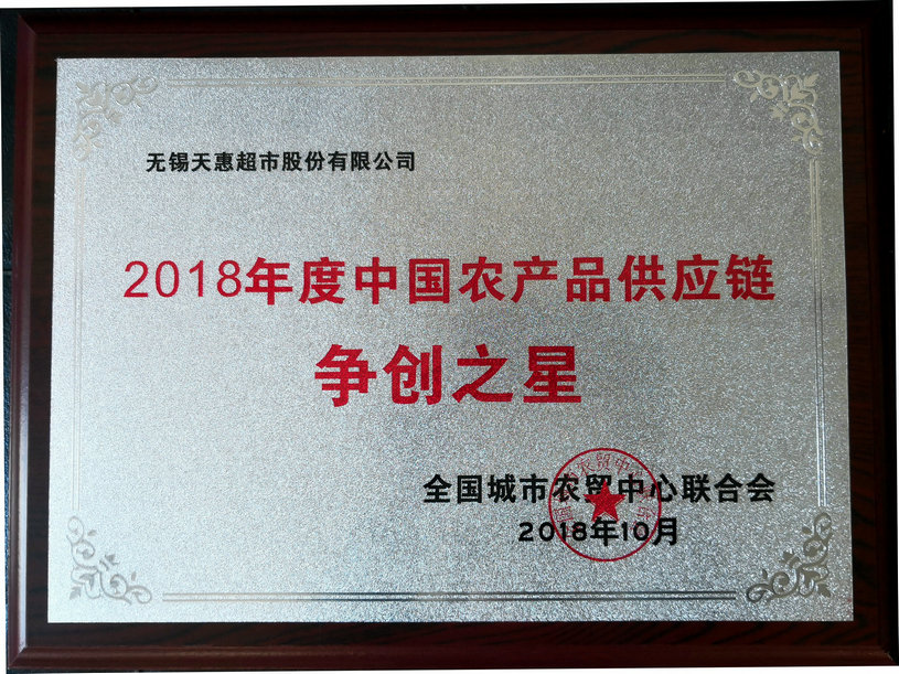 無錫天惠超市股份有限公司榮獲“2018年度中國農產品供應鏈爭創之星”稱號。