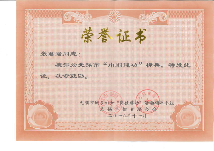 根據無錫市城鄉婦女“崗位建功”活動領導小組、無錫市婦女聯合會聯合發文的錫城鄉婦【2018】3號文件獲悉,江蘇無錫朝陽集團股份有限公司董事長張君君榮獲“無錫市巾幗建功標兵”榮譽稱號。