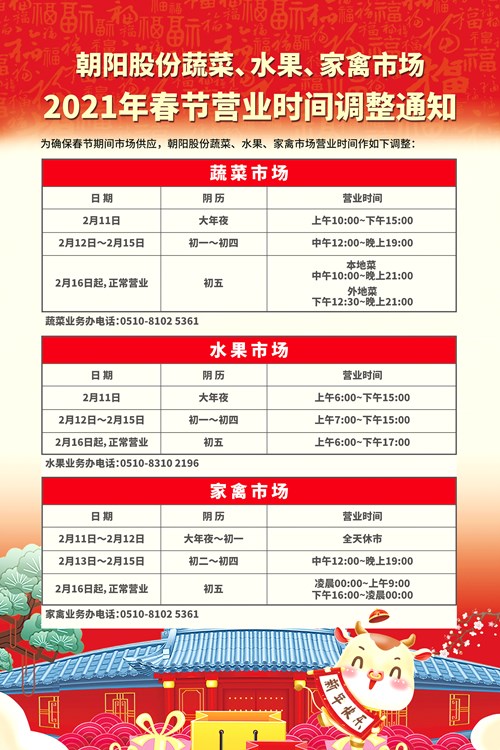 為確保春節期間市場供應,無錫朝陽股份有限公司蔬菜、水果、家禽市場營業時間作如下調整: