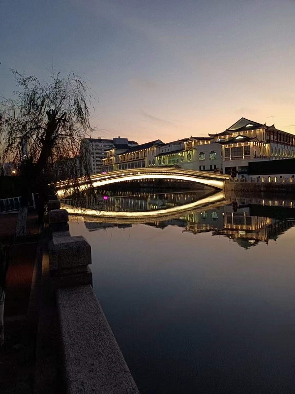 | 號外!號外!號外!就在剛才歷時6個月工期的羊腰灣橋舉行了隆重的開橋儀式。 該羊腰灣慢行橋通行后不僅縮短了羊腰灣路附近的居民來朝陽農(nóng)貿(mào)市場、工藝品市場、魚鳥寵物市場采購游玩的路程、緩解了槐古路的交通壓力,而且為古運河上增添了一個靚麗的風景。 羊腰灣慢行橋橫跨古運河,西側(cè)為槐古路,東側(cè)為羊腰灣路。寬度40.8米,西側(cè)駁岸標高為3.0米。東側(cè)駁岸標高3.8米左右,該段古運河為旅游航道,最高通航水位2.5米,通航寬度12米,通航凈高2.5米。總投資2285.5萬元。 傍晚的羊腰灣橋亮化燈開啟后,加上工藝品市場古色古香的復古外觀造型也是古運河上的一道風景。(朱亮)