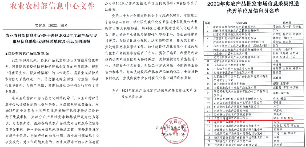 近日,集團收到農業農村部關于表揚2022年度農產品批發市場信息采集優秀報送單位及信息員的通報及感謝信,對工作成績突出的無錫朝陽農產品大市場及楊陽、胡亮、沈磊等3名信息員予以表揚。