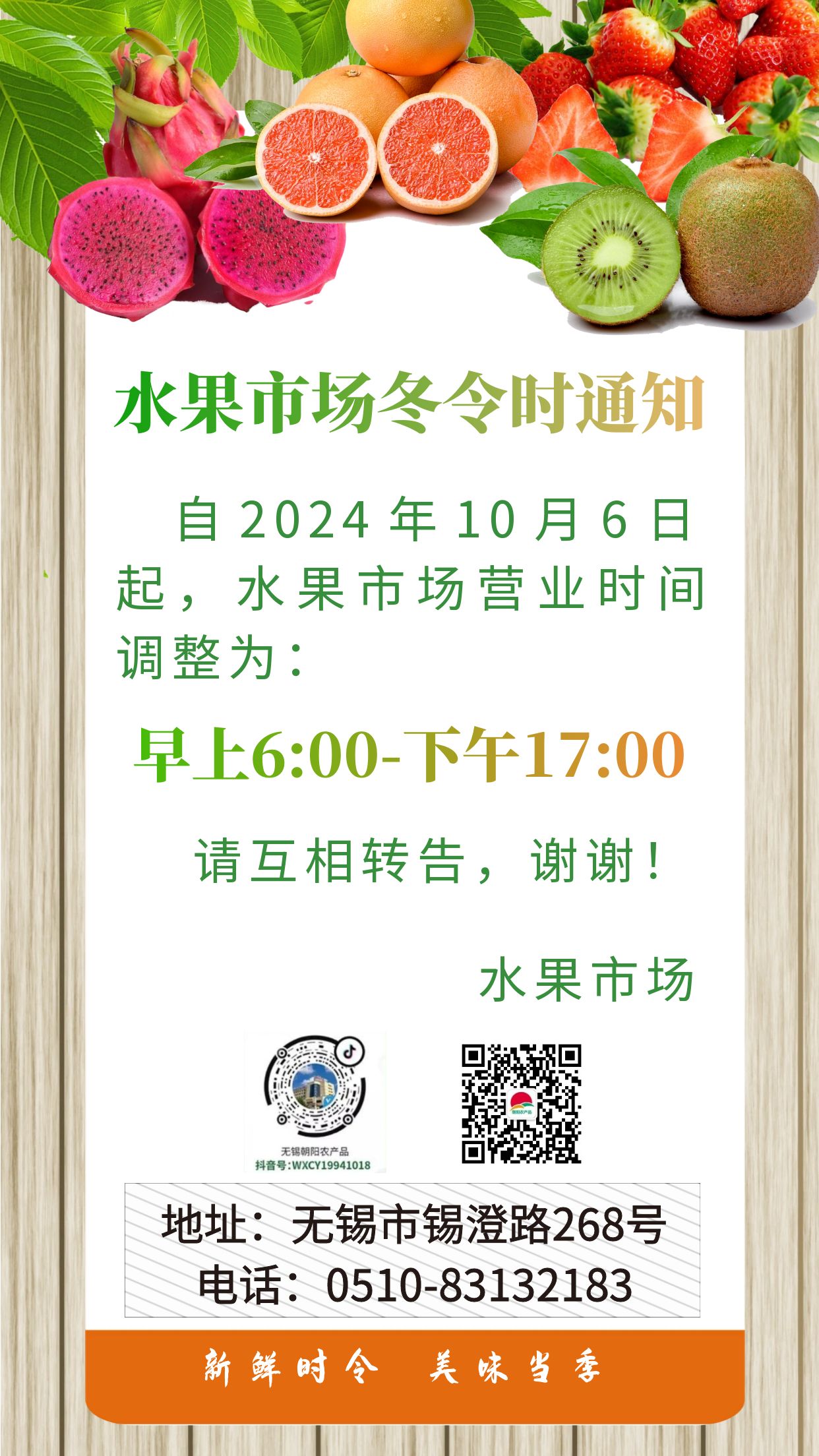 日起,朝陽股份水果市場將調整為冬令時營業時間: