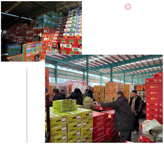 走進水果市場,各個倉位商品品類齊全,貨源充足,受老百姓青睞的年貨果品交易量增長迅速,近一周水果市場交易量環比上周增幅達24.8%。在年貨節禮金券的推動下,蘋果、耙耙柑、車厘子、臍橙等單品銷售火爆,目前蘋果日均交易量742.5噸,耙耙柑日均交易量729.1噸,砂糖橘日均交易量400噸,臍橙日均交易量331.9噸,車厘子日均交易量222噸,水果市場日均交易量超50噸的單品達16個。